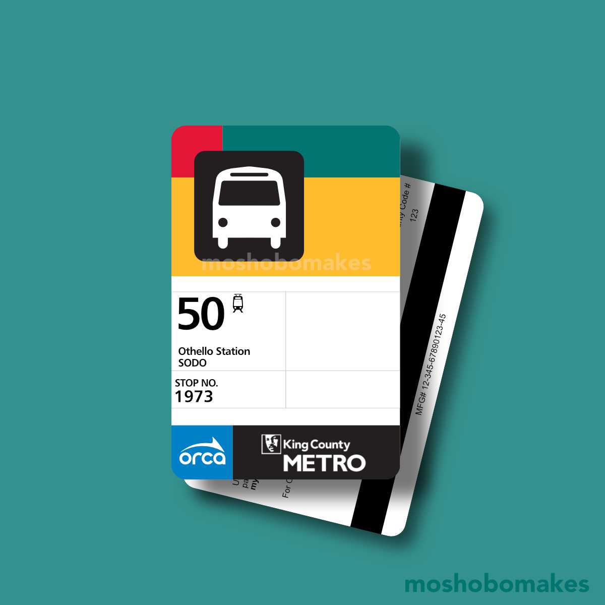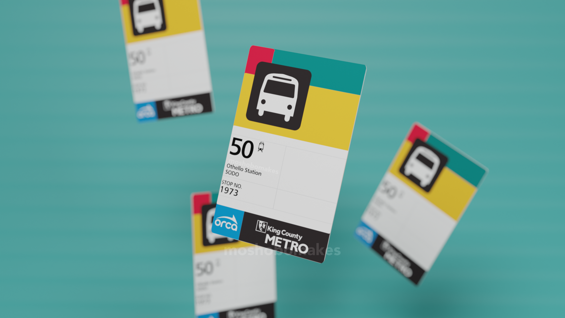 In celebration of the 50th Anniversary of King County Metro, I designed this commemorative ORCA card. The card design imitates a typical bus stop sign you’d find around King County. This one in particular features the #50 line, which today takes Seattlites between SODO and Alki Beach. The stop number, No. 1973, signifies the year that Sound Transit was founded. To complete the standard of including both the ORCA and local agencies logos, I placed them in the space at the bottom typically used for additional stop information.
